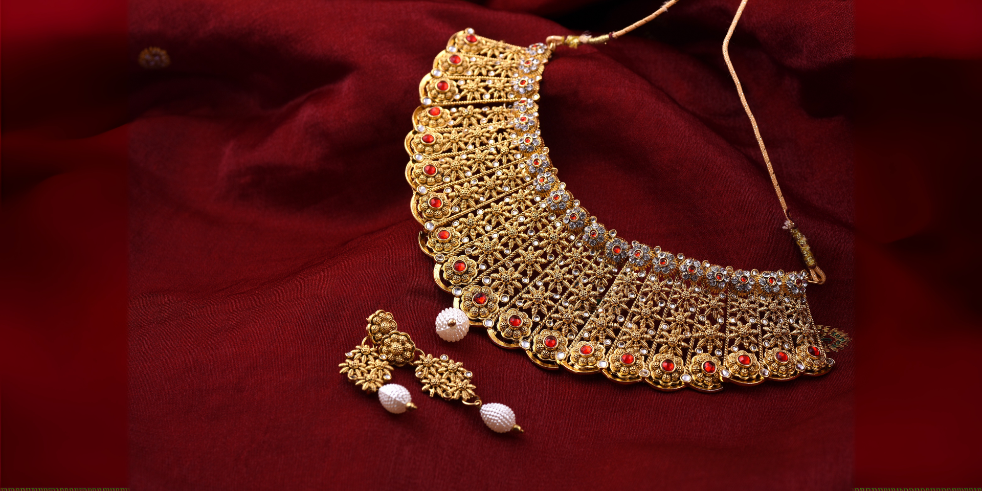 This Deep Red Kundan Necklace Set showcases exquisite craftsmanship with multiple strands of faceted deep red beads complemented by gold-toned...