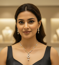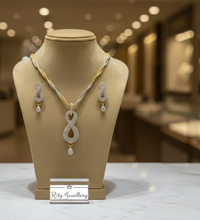 This Infinity Symbol Pendant and Earring Set features a distinctive twisted two-tone chain blending gold and silver hues for a contemporary appeal. The pendant displays a sleek, figure-eight design adorned with clear stones for subtle sparkle, complemented by a delicate teardrop-shaped stone that adds refined movement. Matching drop earrings echo the infinity motif with the same elegant stone detailing, creating a cohesive and sophisticated look suitable for both formal occasions and everyday elegance.