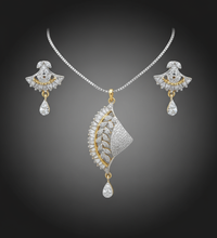 This expertly crafted jewelry set features a fine silver-toned chain necklace paired with matching earrings, showcasing an abstract, fan-shaped design in complementary silver and gold tones. The pendant and earrings combine densely paved round clear stones with baguette accents and swirling leaf-like patterns, creating a refined contrast. Each piece is finished with a delicate teardrop-shaped clear stone that adds graceful movement. Ideal for those seeking a sophisticated, contemporary look, this set balances intricate detail with modern elegance.